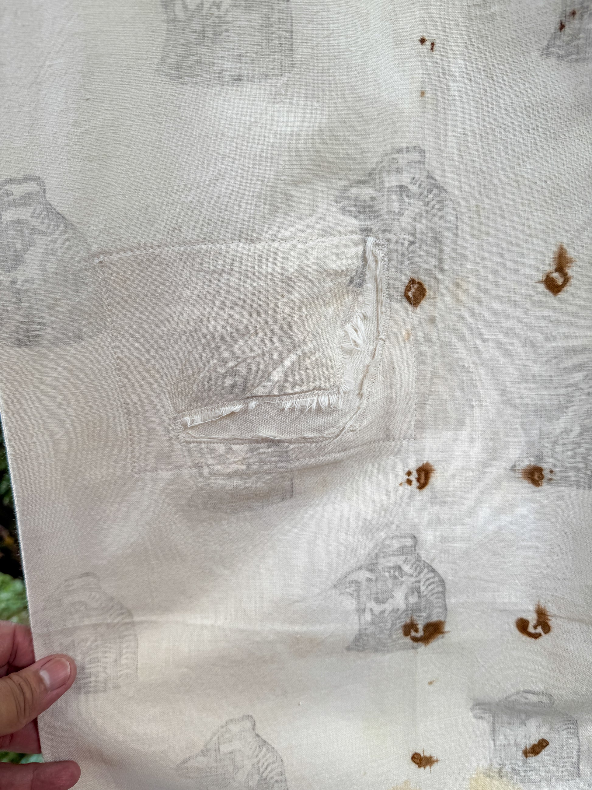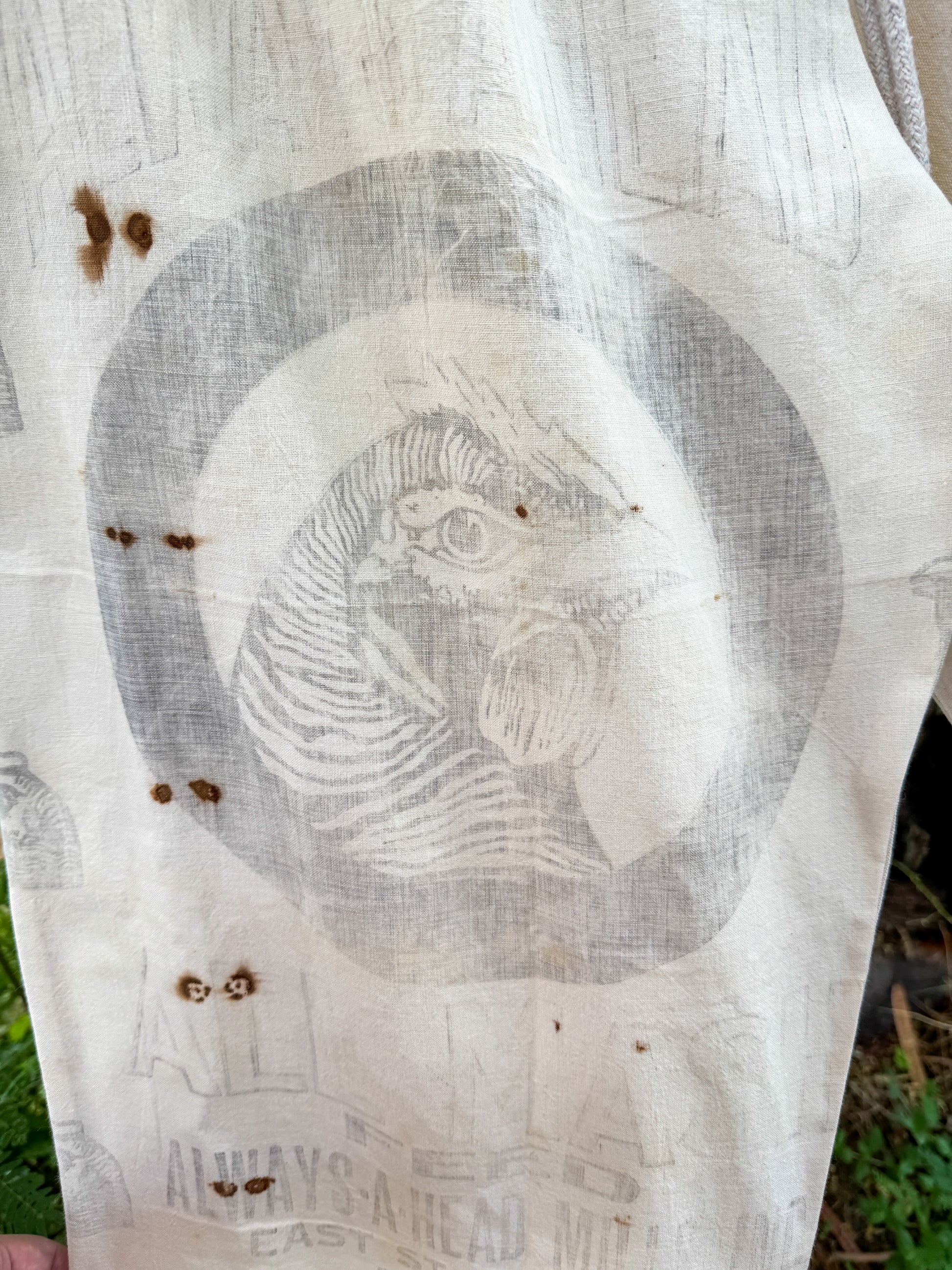 Made from a vintage feed sack and canvas. For those who prefer a more worn in look. Features rust dyed parts and faded ink logo on front and back