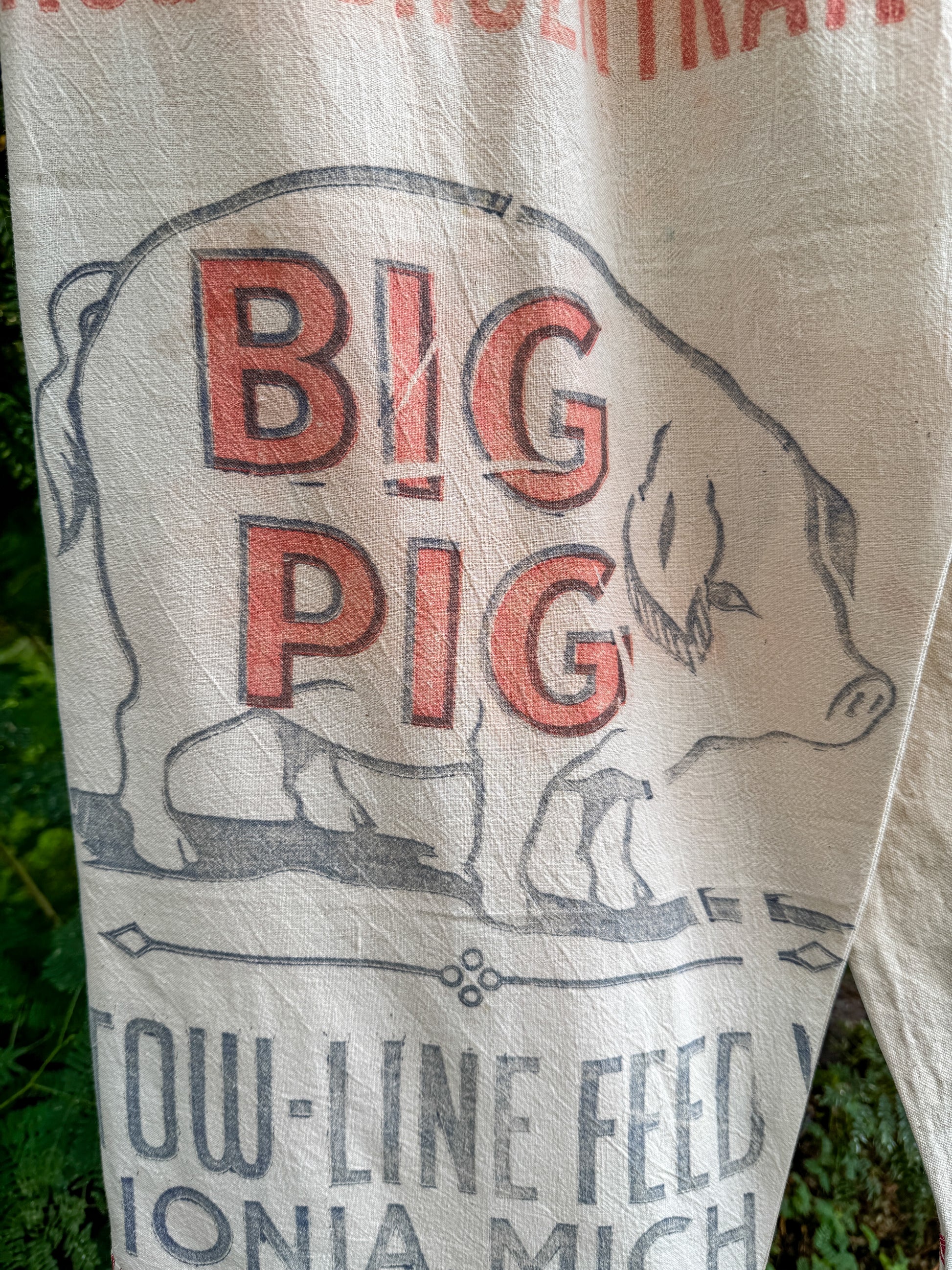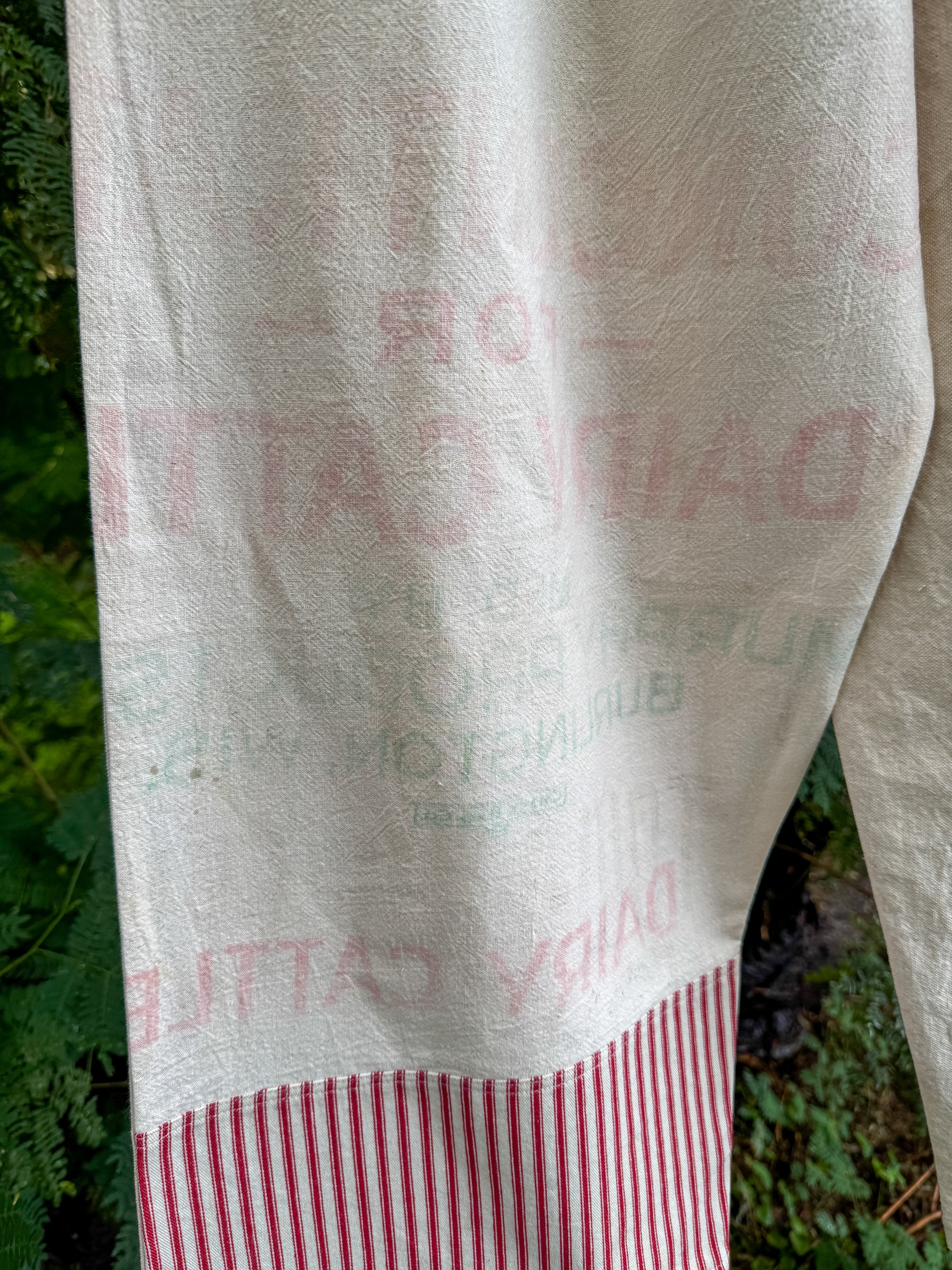 Made from a vintage feed sack, red ticking fabric, and canvas. Amazing front logo accented by red ticking fabric.