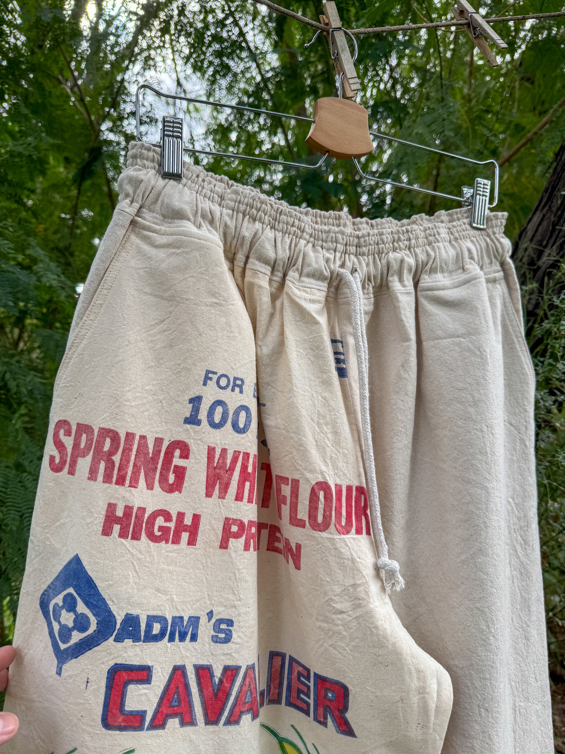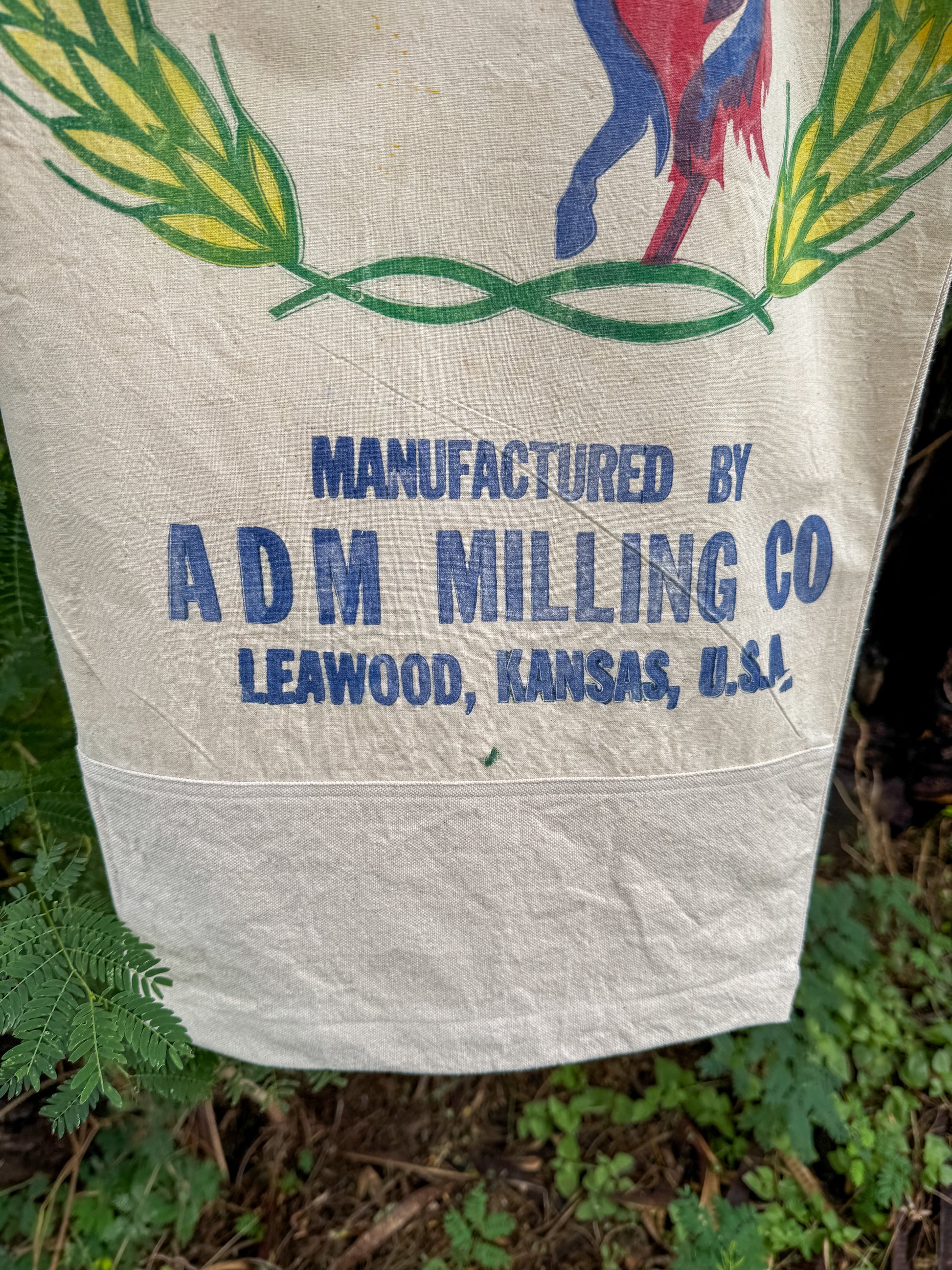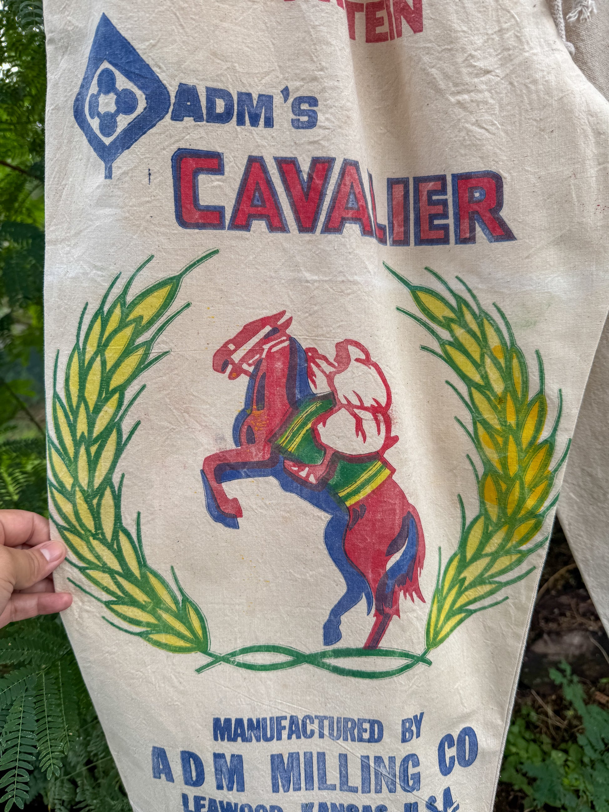 Made from a vintage feed sack and canvas. Great front logo with a transfer print on the back side.