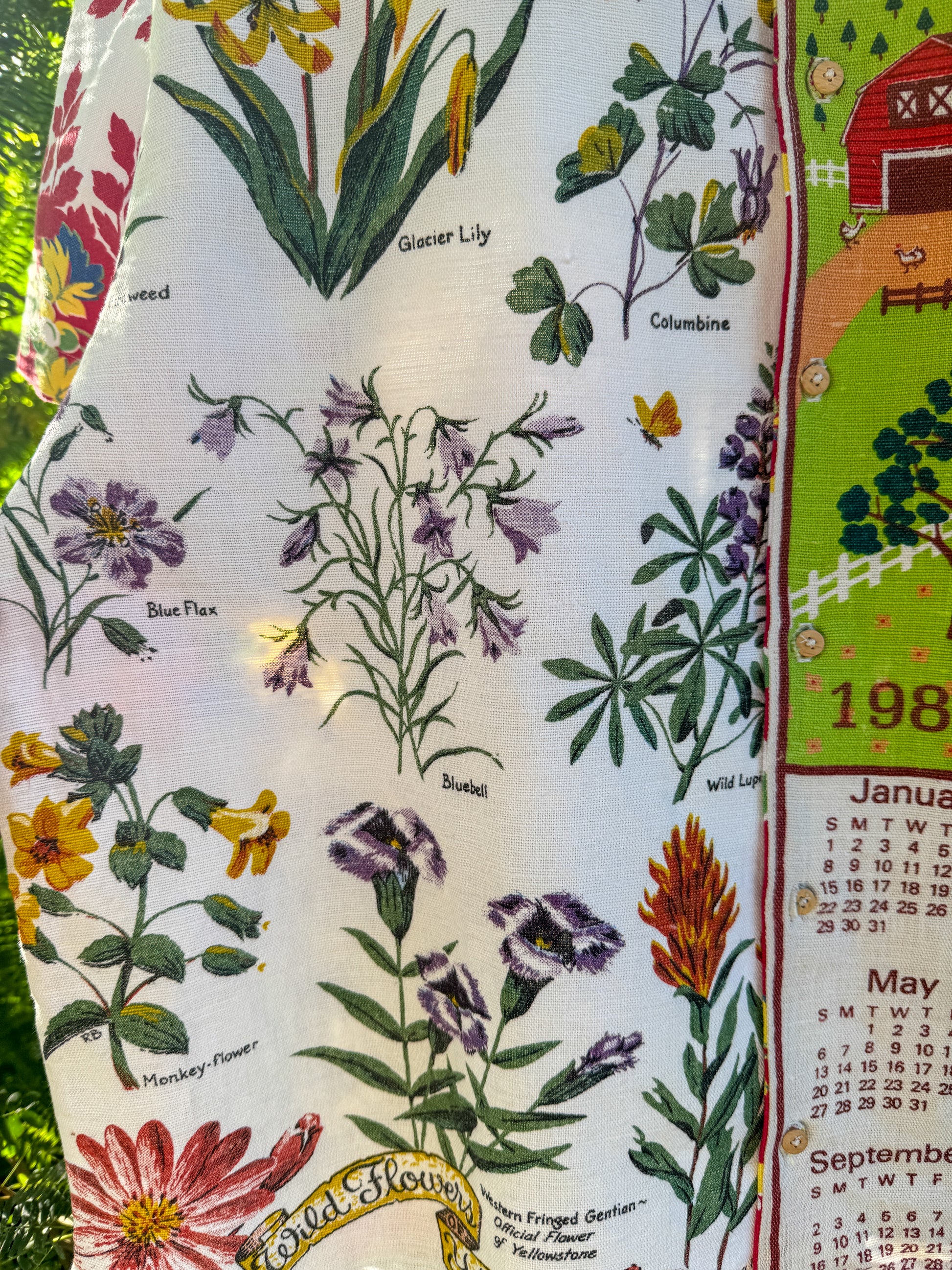 Made from seven vintage tea towels. Gorgeous details and pictures throughout. Truly unique! Material is cotton/linen.