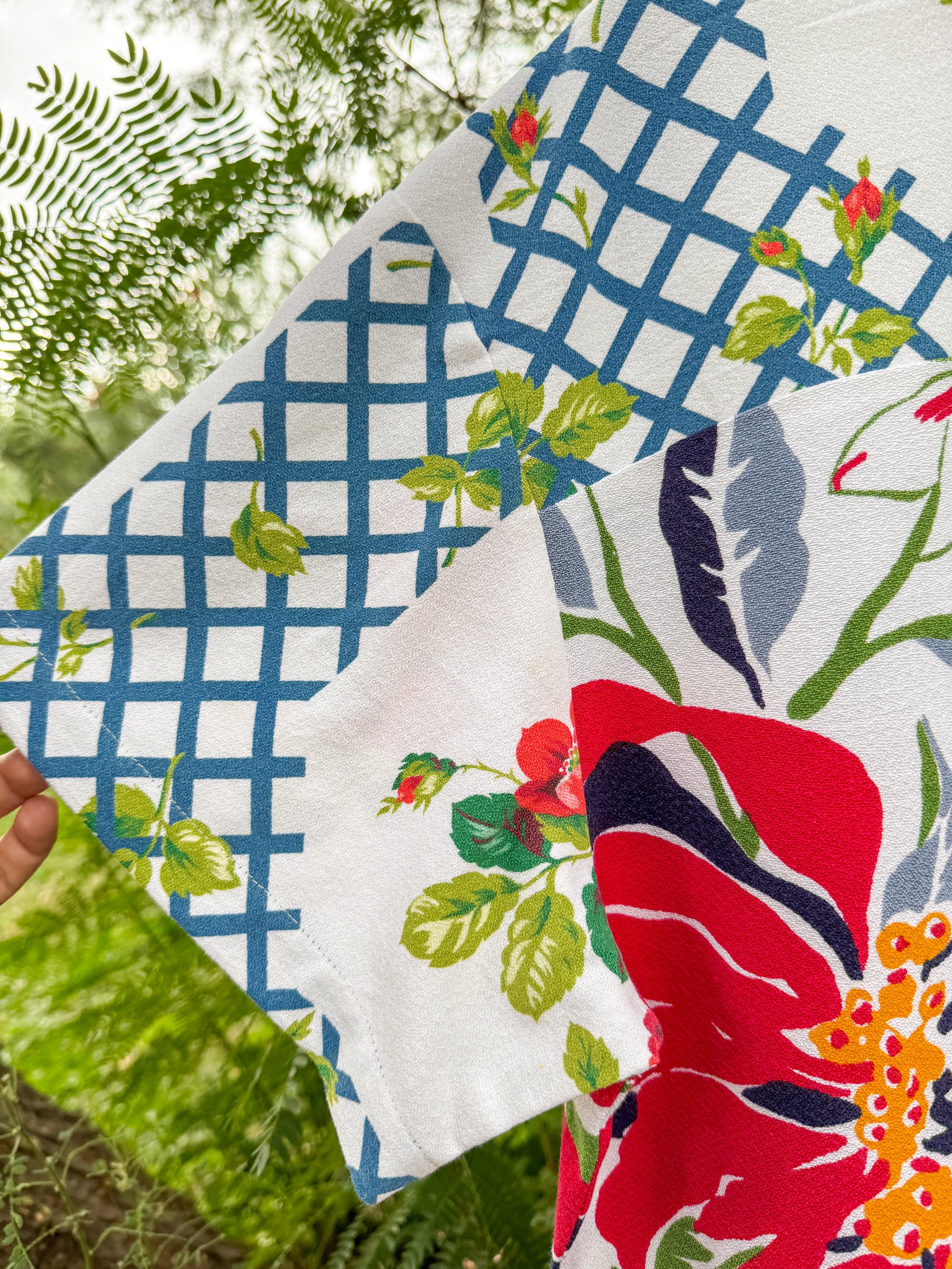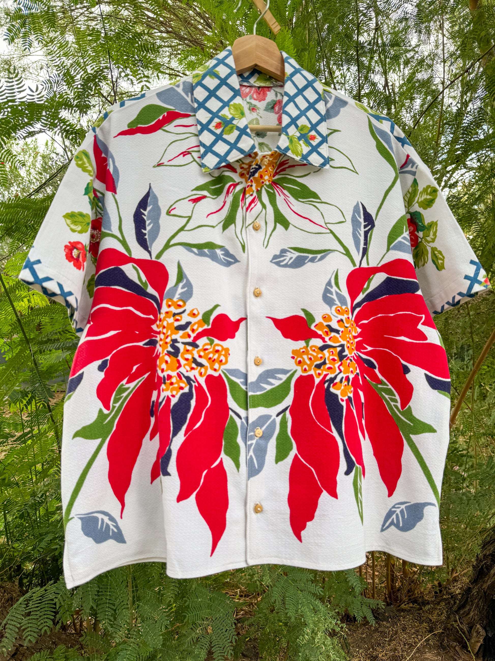RED FLORAL TABLECLOTH BUTTON UP (MEDIUM)